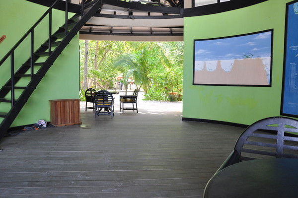 这是海洋中心,墙上就是岛周围地势。水屋在最右边的小坡上,日出房浮潜有多差,看这图也明白了吧。