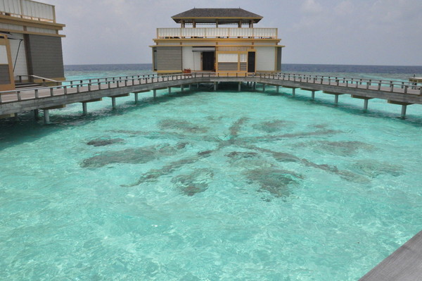 去之前就听说悦榕庄的SPA非常有名,上岛以后第三天预约的,岛上中国员工LEO给我们介绍说145刀的二重奏是性价比最高的,所以预定了最后一天中午11:30,11点退房,然后从水屋坐穿到主岛做。2个半小时,身体按摩90分钟,头部按摩30分钟,牛奶浴30分钟。SPA中心的人说英文,不会中文。身体按摩还要3选1,英语不好,只能比划了,服务员给你介绍的时候都跪式服务,这在国内应该很少见的。SPA是脱光所有衣服做的,换衣服的时候技师出去,你趴在床上的时候用一块布盖住全身,要按哪就把哪里掀开。总的说来,SPA的环境非常好,但是做完没觉得身体多舒服,一起做SPA的另外一对中国夫妇的评价也是这样,他们开玩笑说是以前做过的人发帖子继续骗人……我的感觉就是,如果你要做SPA不要期望太高,就图个新鲜,我觉得不如国内良子足疗舒服呢……