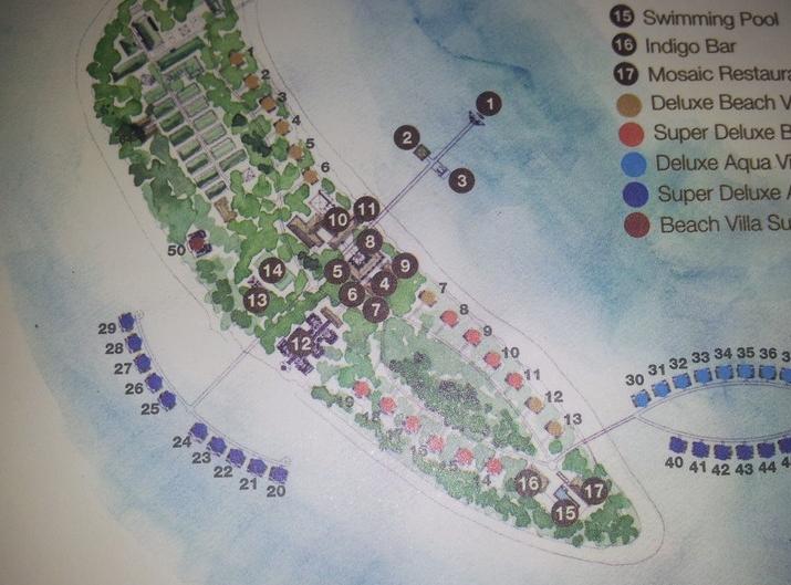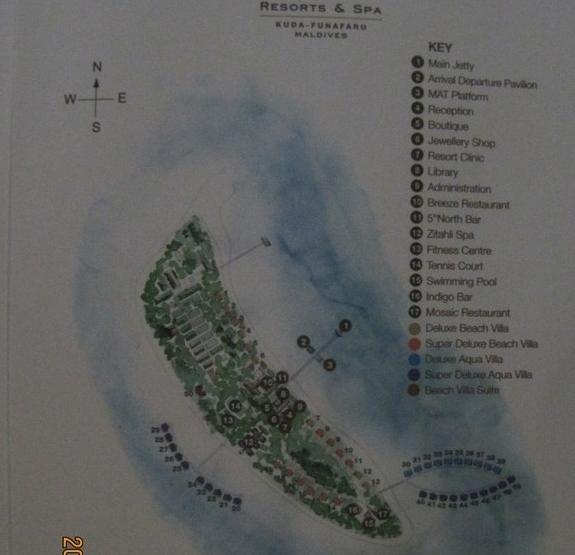 在这个图片上大家就可以看到每种房型的具体位置了,我们水屋住的是单排的26号房间,沙屋住的是14号房间。因为当时有去过的朋友告诉我,单排水屋和沙屋NO.14-19这边私密性好,浮潜好。于是我们上岛之前给岛上发过EMAIL,要求他们帮我们把水屋安排在NO.20—29,沙屋安排在NO.14—19。岛上回复是不能保证,不过等我们上岛之后房间的确是按我们要求的安排了。上岛之后实地考察发现单排水屋和沙屋NO.14-19都是可以看日落的,而且私密性好,浮潜也不错。双排水屋那边和沙屋NO.7—13是可以看日出的,据说因房间多可能私密性可能照单排那边差一些(听朋友说的,不知道真假),不过在岛上遇到的一对夫妻说那边房间里超热,开了空调也很热。