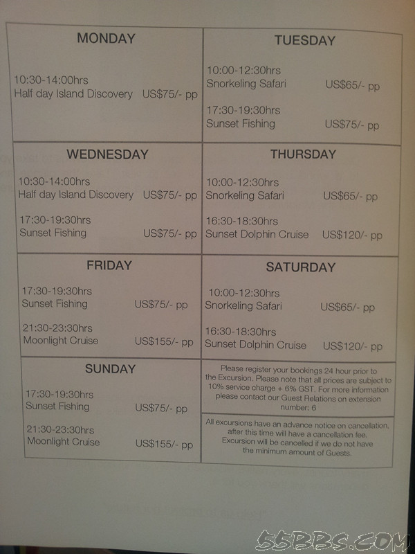 从周一到周日,每天的自费项目表。这个表里的价格都是没有加上服务费和税的,所以要另外再加上10%的服务费和6%的税。