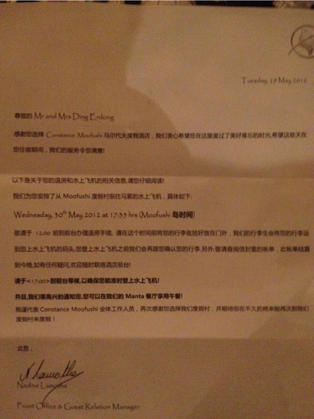离岛那天是12点退房,下午5点水飞离岛。行李放在门口就可以了,一般马代酒店是不含离岛那天午餐的,离岛休息室里面有免费点心和水,但是让我意外的是,moofushi竟然还送了离岛那天的午餐,于是乎,下午两点我们还跑去海吃海喝了一顿。