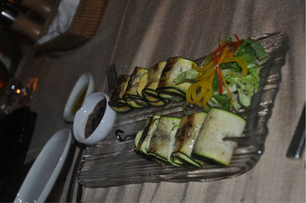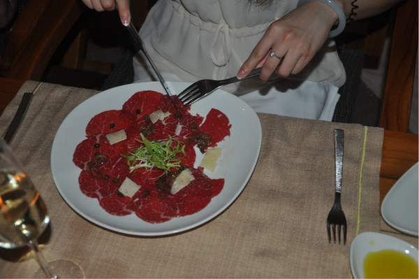 在Alizee餐厅享用的烛光晚餐,由于本人的粗枝大叶,去之前没有研究中文菜单,导致点菜时候看着英文菜单犯傻,手机里面的翻译软件又是在线翻译,最后就稀里糊涂点了几个头菜,配菜啥的,不过吃了几天自助偶尔小清新一下感觉还是不错的。 随便点的头菜牛肉,结果上来是生的雪花牛肉,口感很好!