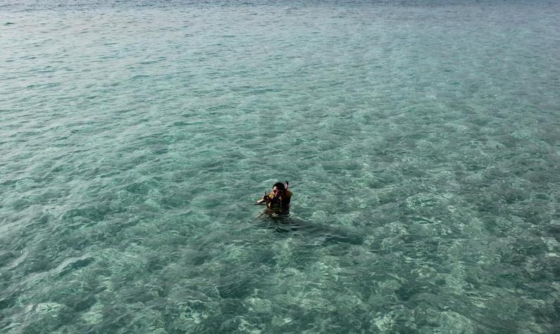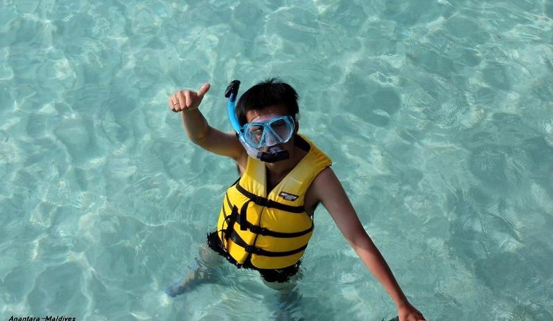 无边的大海让心情非常舒畅,只可惜迪古岛水屋这边珊瑚很少,基本上没有鱼群,我们打算先练习练习,