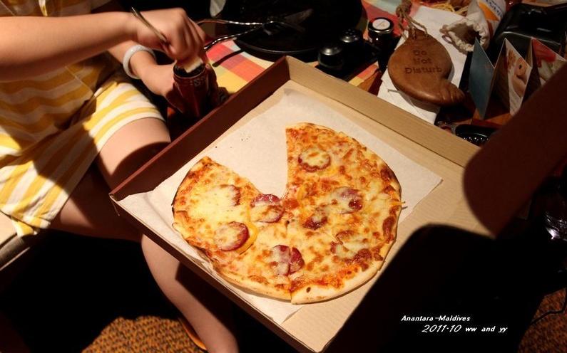 在房间拨“0”就能直接打到前台,我们叫了一份意大利辣肠披萨,足够我俩吃了,喝着我们带过来的旺仔牛奶,