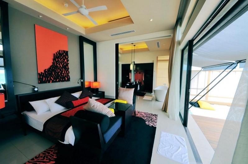 面对大海的一面是玻璃。外面有个泳池和弹簧床。