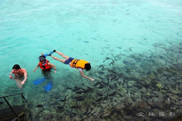 美人蕉岛有三个好地方:第一处位于水上屋尽头,那里是浮潜的最佳地方,阳光直射清彻的海水,一眼就看到海面下好多漂亮的鱼在散步.