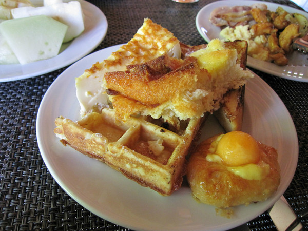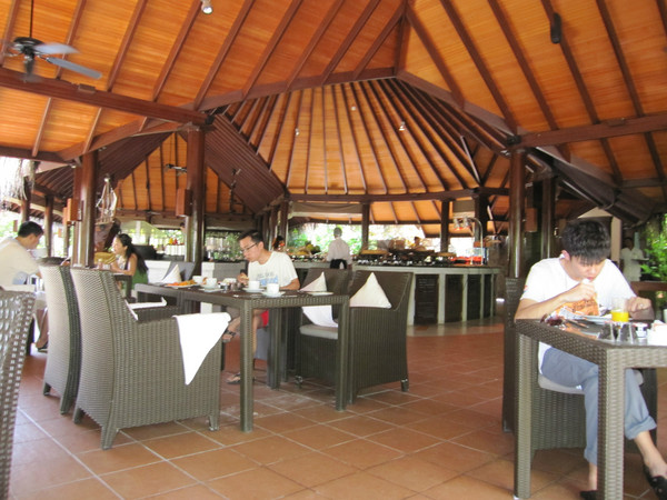 接下来看看餐厅,我和老公是订的BB ,小气的我算了算,还是BB比HB核算些,哈哈。在岛上有好几家餐厅,从早餐开会吧。早餐是固定在four corners。水果有,面包有,肉肉有,鸡蛋液有,果汁大大滴,就是海鲜木有,法国矿泉水啊,茶啊,咖啡啊另外收费