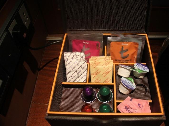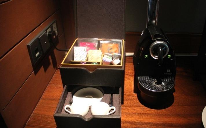 屋子里的小吧,咖啡和茶都是免费的。咖啡有三种口味,选个喜欢的直接把咖啡胶囊丢进咖啡机就可以了