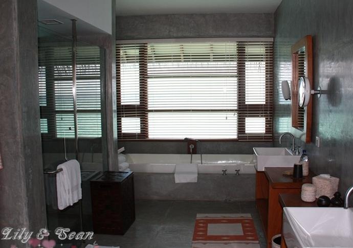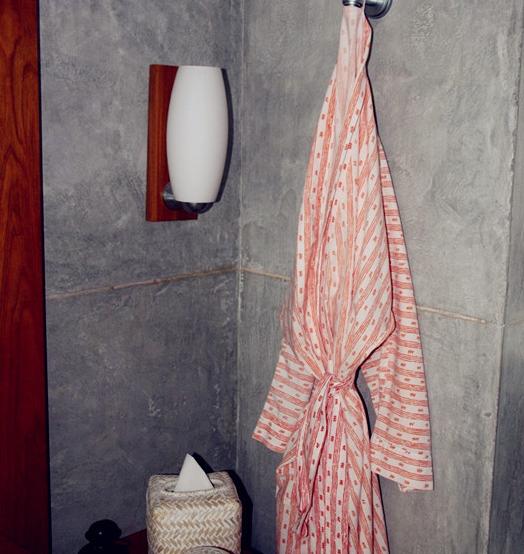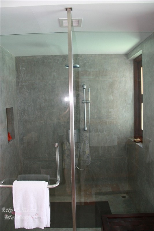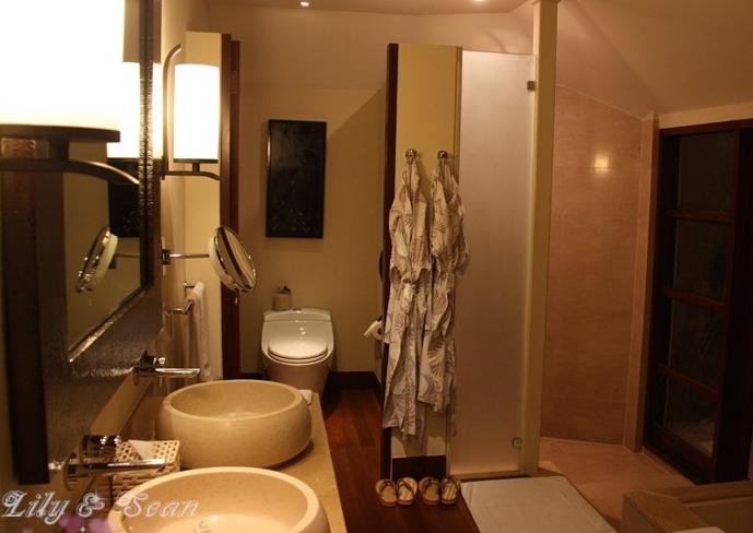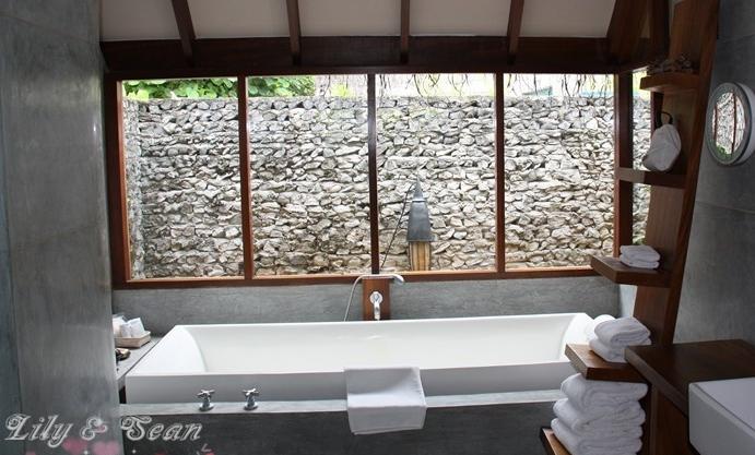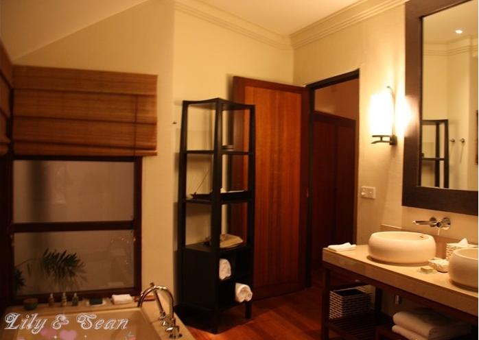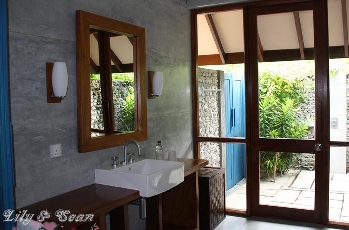 继续下来是盥洗室,有两个面盆,一个室内淋浴,一个室外淋浴,还有个室内浴缸。室外淋浴的私密性也很好,小子就是在室外洗的,说看着星星冲凉,感觉好极了!