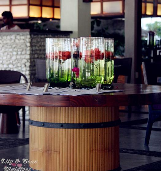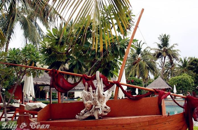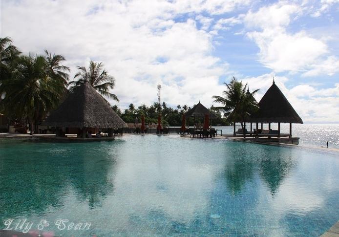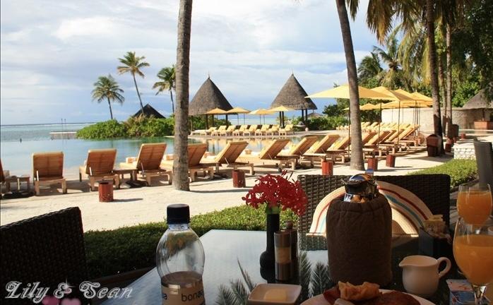 1、Café Landaa:离接待大厅很近,紧邻大爱的无边泳池,每天的免费自助早餐就是在这里用的,这里的饮食性价比比较高,也是四个餐厅中比较符合亚洲人口味的。每天早上都提供各国语言的报纸,有中文的哈,内容也很丰富。特别说一下,这里有个中国GO,叫Jeremy,好像是上海人,人特别好,特别热情,第一天给我们介绍很多有特色的美食,之后每天都过来问候我们,和我们聊天,介绍Landaa的各种特色活动。Jeremy说,能在Landaa看见中国人,感到特别的亲切,原来最多有2对中国情侣同时在岛上,而且亚洲人都很少,这次一下看到这么多(算上丫头&小子,一共5对中国情侣),真是感觉很好!他说他到Landaa的第一项工作就是把四个餐厅的MENU都翻译成中文的,所以以后去Landaa的朋友们有福啦,记得要Chinese Menu哈~