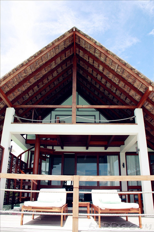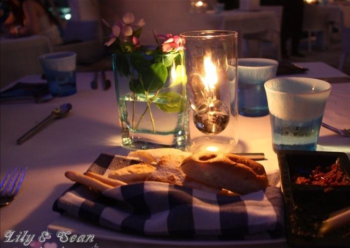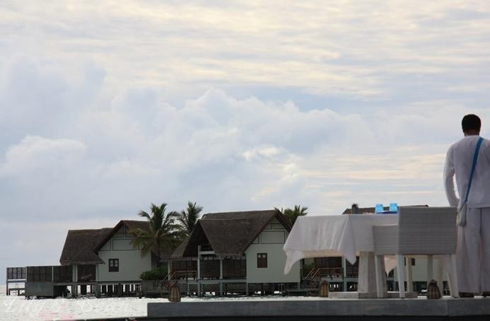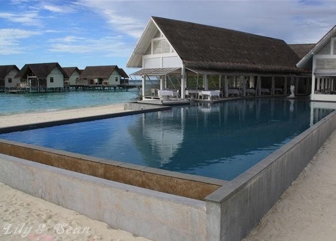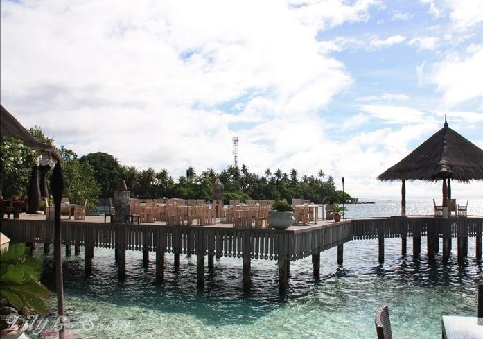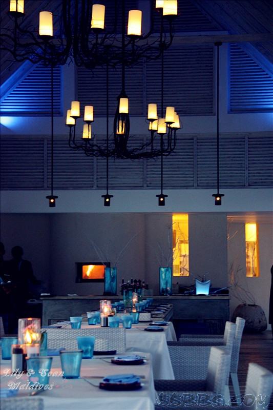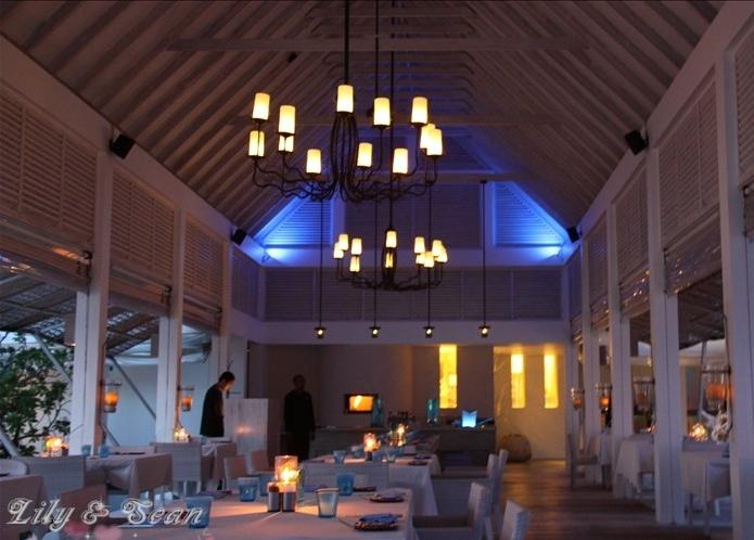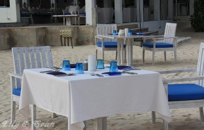 2、BLU餐厅:离水屋区很近,边上就是美丽的拖尾沙滩。整个餐厅蓝白相间的装饰,给人清凉舒适的感觉~这里的饮食偏西式,消费也相对其他三个餐厅高些,但是环境也是最有情调的,而且还有在拖尾沙滩的专享晚餐哦~