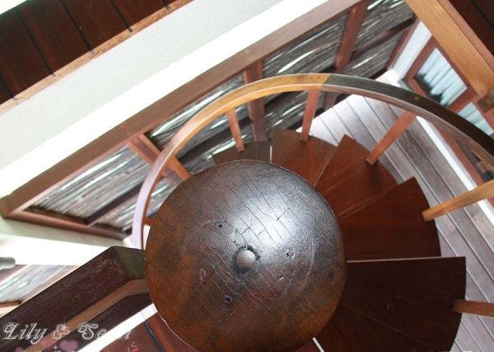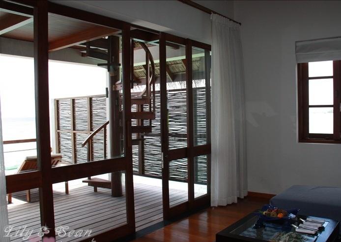 Landaa的水屋是分上下两层的,上下层之间是通过露台的转角楼梯连接的,屋内同样放着悠扬的音乐~