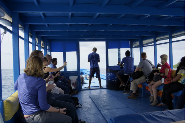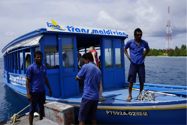 找到他们之后核对信息,就给你水飞的机票了,然后去水飞称重的地方,把托运行李和随身行李都称重,这个不能超重,水飞托运的行李限额是每个人20公斤,一般国际航空公司也是20KG,不过阿航还是比较大方的,30KG,不过别装到30,不然水飞托运的时候就要多交钱啦,呵呵。称好之后小黑就把要托运的行李带走了,然后你跟着坐BUS,带你到Kuramathi自己的水飞候机室等候水飞。在这里吃、喝都不要钱,好好享受吧,而且折腾到这里又累又热,水飞候机室里的空调还是很凉爽的。