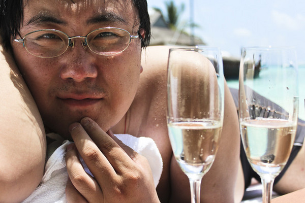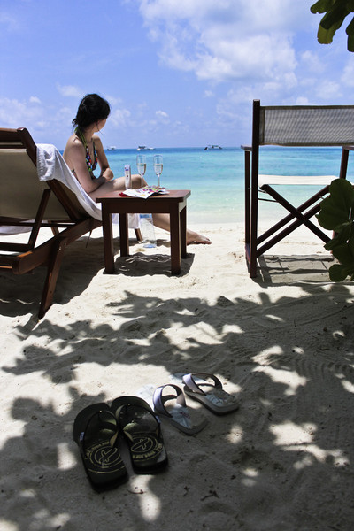 试了淘宝买的浮潜装备,反复地下海浮潜,上岸晒太阳,涂防晒,喝香槟吃零食,顿时感到了度假的乐趣!太阳好舒服啊,晒在身上暖暖的,剌剌的,但就是想暴露在这样舒服的沙滩上,不舍得躲起来。Baros的沙滩屋私密性很好,出了房间就是一个被植被包裹的面向大海的小院,再加上岛上很难看到人(但凡看到的亚洲面孔也都是日本韩国人),就算裸晒也不会怕被看到。
