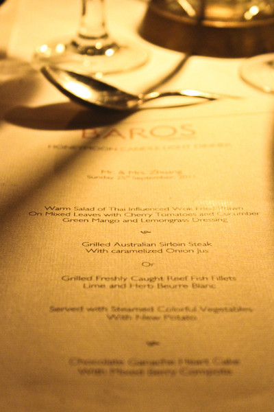 今天晚上,Baros给我们安排了沙滩蜜月晚餐(免费的),我们晚上8点准时到前台等待接送,然后小黑给我们拍了合影就带我们去沙滩了。我们到的时候已经坐了一排情侣了。沿着沙滩立着一排火把,气氛非常浪漫。我们被带到了倒数第二个桌子前,看来还有最后一对情侣没有来。