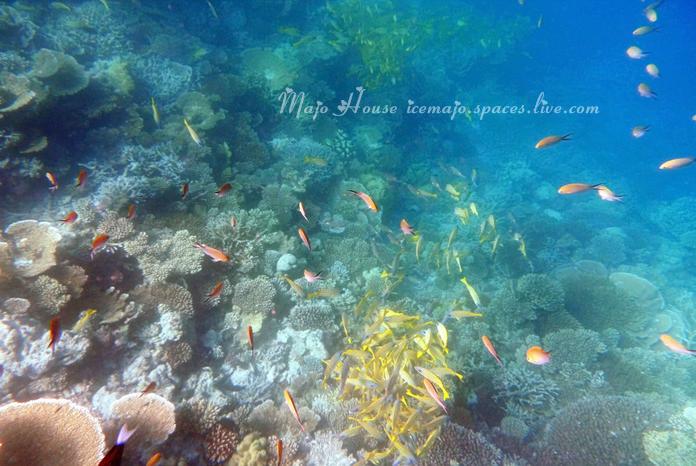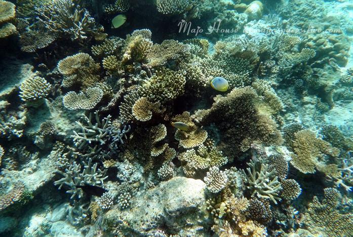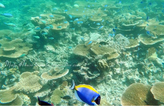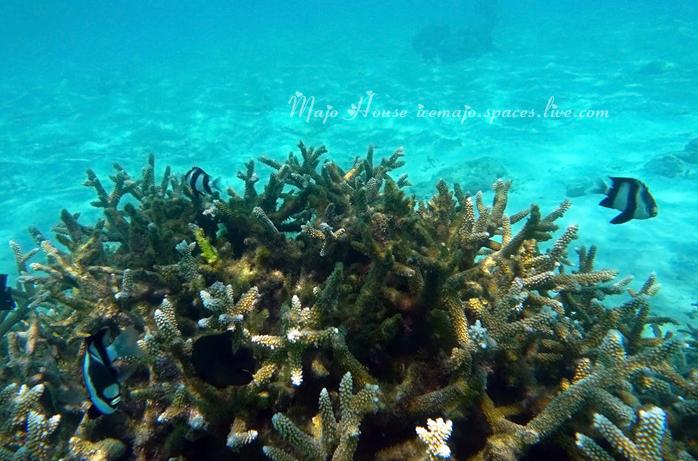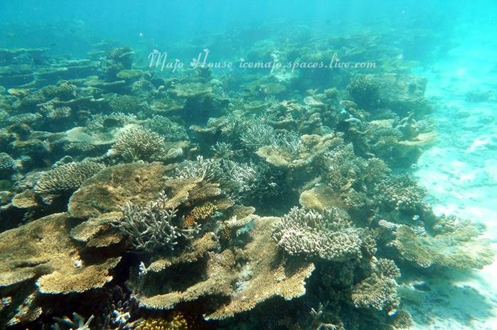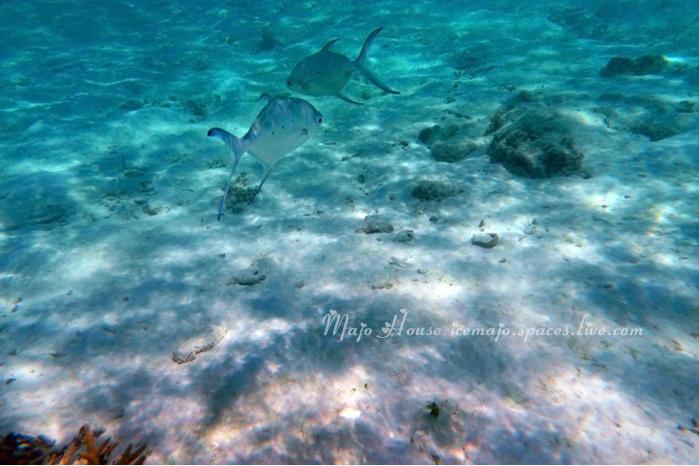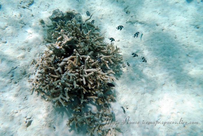 大概从大岛的沙滩屋#235的沙滩处下海,一路这么游出去就会碰到那一大片的珊瑚。当然我们还不敢独自出海的,所以这还是有参加活动 Discover Snorkeling. (很便宜的,一个人只要20. ) 首先潜水老师带我们从浅滩处慢慢游过去,最开始水大概只有到腰部,珊瑚很少,水很透底,不过鱼都很多了。