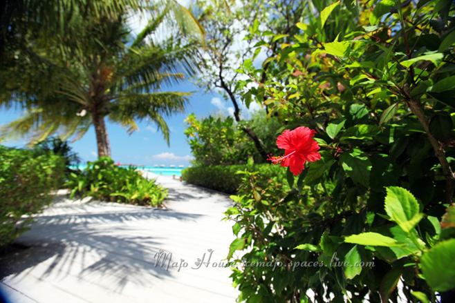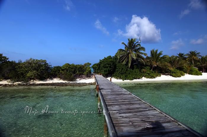 这个是水上屋连接陆地的木堤,树丛的那边,就是另外一面的大海。这个岛的宽度,是非常窄的