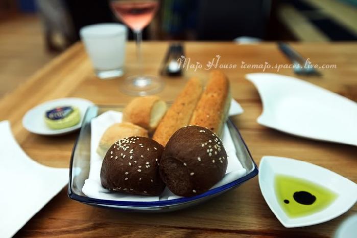 和传统的西餐一样的,酒的后面就是要上面包了。沾的呢,除了黄油外 还有新鲜的橄榄油配特别酿制的醋,后者比较健康。