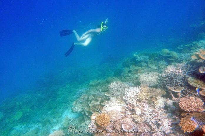 出海的队伍只有4个人还有教练,外加上半路上过来问 "Can I play with you?"的一位好像是瑞典来的姐姐。这位金发瑞典姐姐,非常得厉害。游起泳来就和那个美人鱼一样的自在。她和教练还会比赛技巧,看谁潜得深游的远。不过我们的教练可是土生土长的麻袋人,他号称可以连续10个小时游泳,从这个岛游到那个岛还不带累的。虽然没见识过他长途游泳,但是我看他就不带潜水镜,憋气下到水底可以很深很深,很久很久,一直游到深得看不到他的地方。