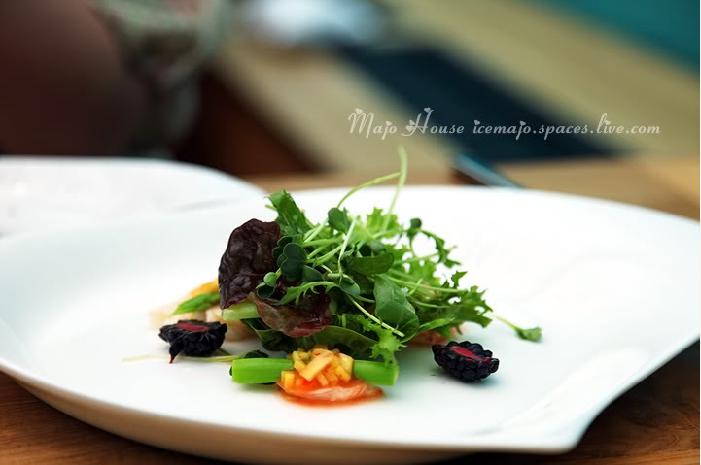 接下来上前菜,Poached Lobster Tail Served Cold, Mixed salad, Green and Ripe Mango Vinaigrette. 芒果醋龙虾沙拉。这个很清爽很清爽的,凉凉的酸酸的很开胃
