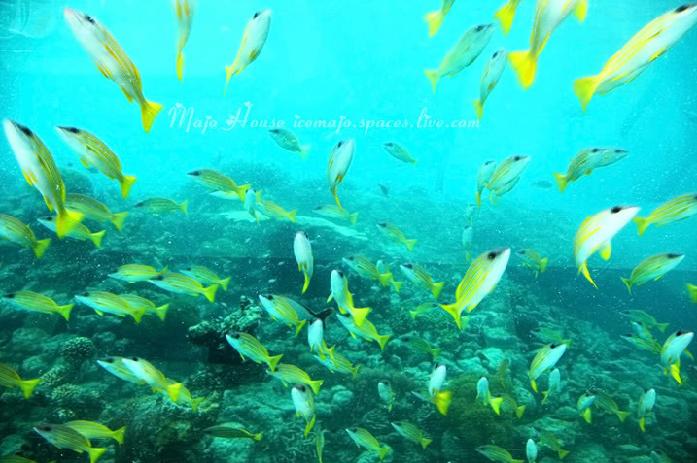 不过室内那块小地方也没有什么看头的,于是还是出来外面,坐在长木堤的边缘,看水中Ithaa的朦胧身影玩。最开始猛一下觉得只能看到一个轮廓,慢慢的连里面的桌子,椅子,桌子上面的盘子都可以看得清清楚楚地。同时也都看到很多很多的鱼在这附近游来游去的。 原本我还非常在意的说,如果我去吃饭的时候没有鱼看的话,那也未免就太凄惨了。