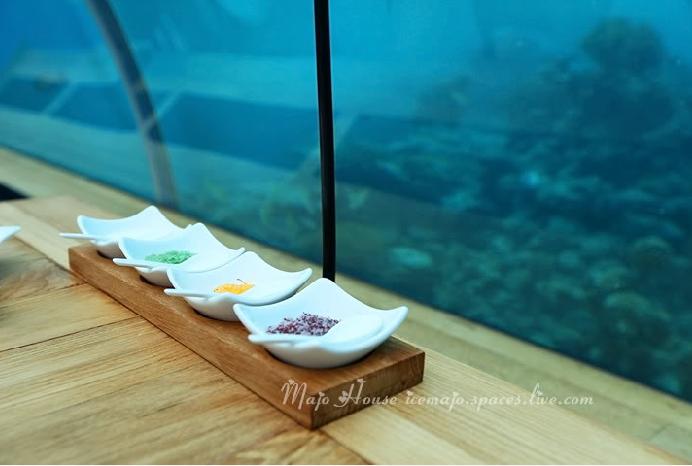 今天中午的客人并没有很多,加上我们只有另外两家人,一共才9个人。 客满的时候,Ithaa 也只能接待14位客人而已;所以如果要去吃饭,是一定要提前预约的。 晚餐会比午餐更加热门,不过我自己觉得天黑黑的是不是会看不到鱼呢?所以我从一开始就决定吃午餐的,当然啦,午餐也都比较便宜点