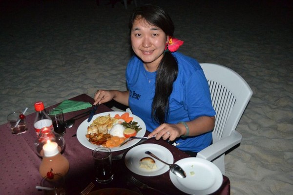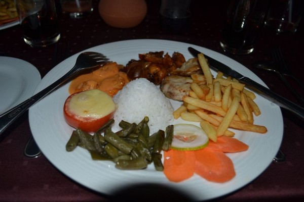 供应欧洲和东印风格餐点.使用刀叉,可以品尝到新鲜的熟肉,海鲜,当地特色的佳肴和水果。因为是自助餐,吃饭点人很多,不过大家都能按秩序排队,因为安嘎嘎岛大部分欧洲人居多,中国人去的少。呵呵,不过餐厅有一个小黑,脸有点胖胖的,卷花头发,会说几句中文,像是谢谢,再见,你好。。。。。。,很热情,可惜啊,没有给他单独留念下