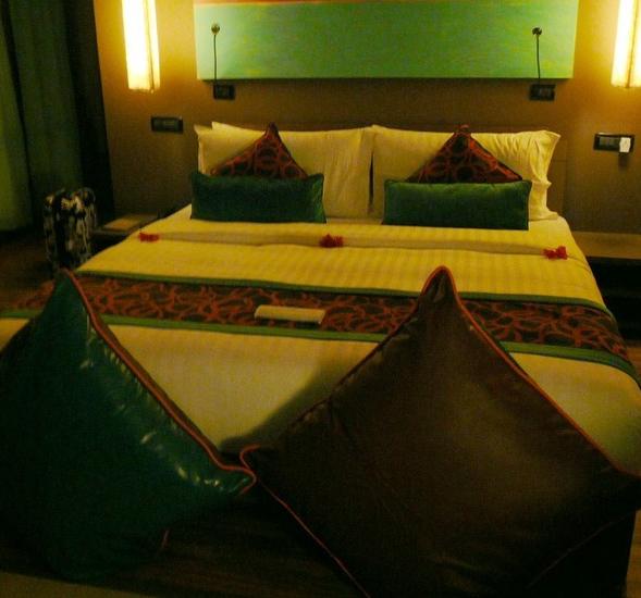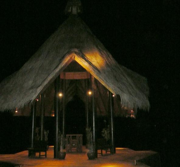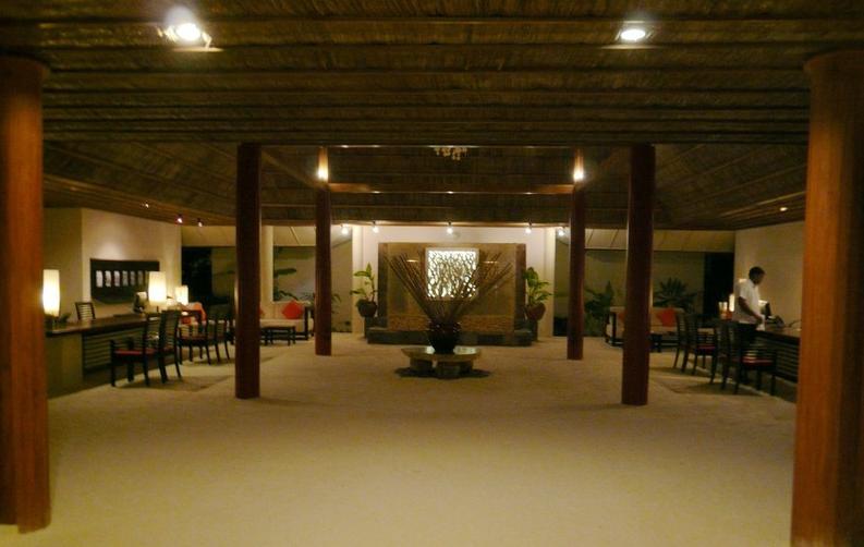 Herathera蓝湾半岛的停泊点是一个尖顶的茅草亭,同时也是这个岛可以举办聚光晚餐的地方,然后亭子与酒店大堂以一条长长的栈道相连,栈道两旁是朦胧的柔和的灯光,像一盏盏烛火,映的人微醉,那种如梦如幻的感觉让我想象着一对新人携手从栈道走向远方,走向幸福的殿堂。酒店大堂不大,都是沙子铺地,以黄红色调为主,红色的沙发,木头的桌子,很有情调,很清新。接待人员送上一杯芒果汁,一跳冰毛巾,让人解除乏意。酒店安排好房间后,给我们发了地图和这周岛上每天会有的活动计划单,为什么这样子呢,因为这个岛确实很大,需要找准方向。