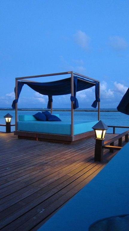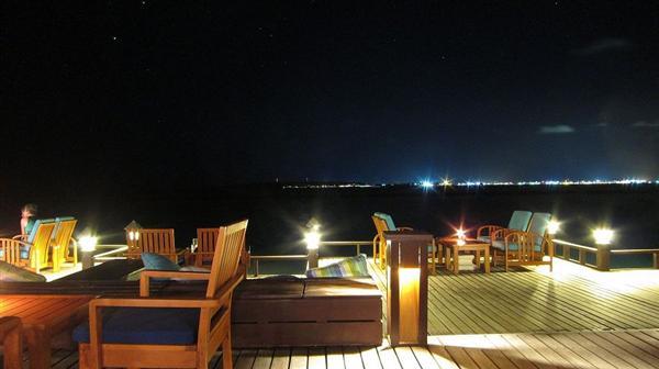 这几晚的晚餐我们都是在海边露天BAR吃的,露天的沙发椅子,蓝色梦幻的床,面朝大海,晚上点上一只红烛,很有情调
