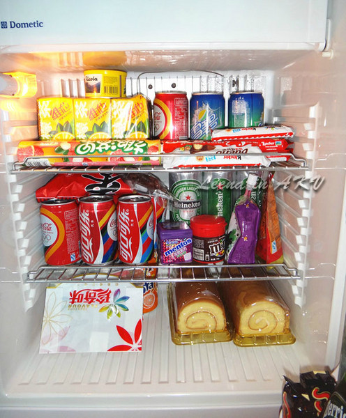你没看错,下图冰箱里的,都是从广州出发的。。可乐、柠檬茶、雪碧、啤酒、美心蛋糕卷……应有尽有。没错,美心蛋糕是为了宵夜准备的