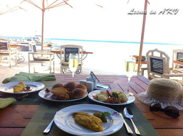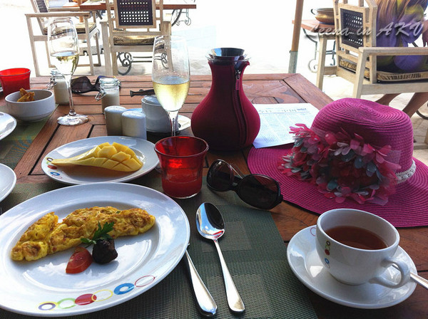 各种早餐各种吃,鲷鱼、三文鱼、牛排、鸡扒、蛋卷、菜花……西瓜汁、椰子汁、可乐、中国茶……早餐是异常丰富。基本上,我俩是“逢饭必到”,吃货也要走向世界!