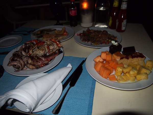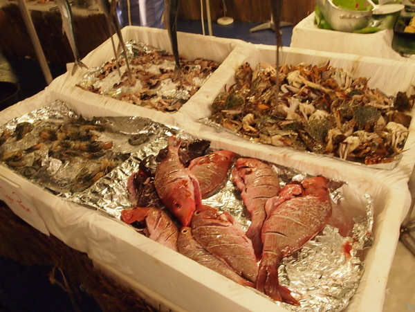 下面展示的可是海鲜大餐喽!螃蟹、大虾、八爪鱼、各种海鱼……这是我们夜钓归来参加的泳池餐厅海鲜烧烤自助,肉质都没得说,绝对的新鲜,但说实话,味道超级超级一般,就是烤熟给你端了上来,其他调味自己搞,可能也是那天太累的缘故,喝了一听啤酒后感觉没了胃口,吃了两口就一点吃不下了