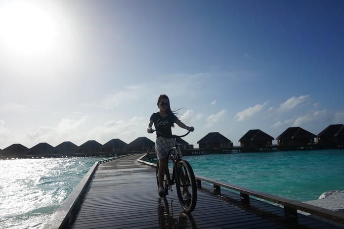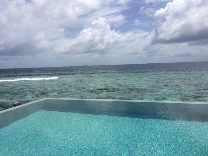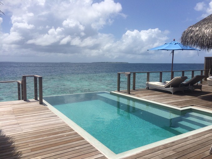 water villa with pool:5字头和6字头两种。5字头泳池在甲板中,私密性相对更好。6字头泳池突出在海面上。离岸边很近,海水拍岸声音较大。6字头水屋距离海沟更近,甲板下水到海沟仅有几米,浮潜省力。