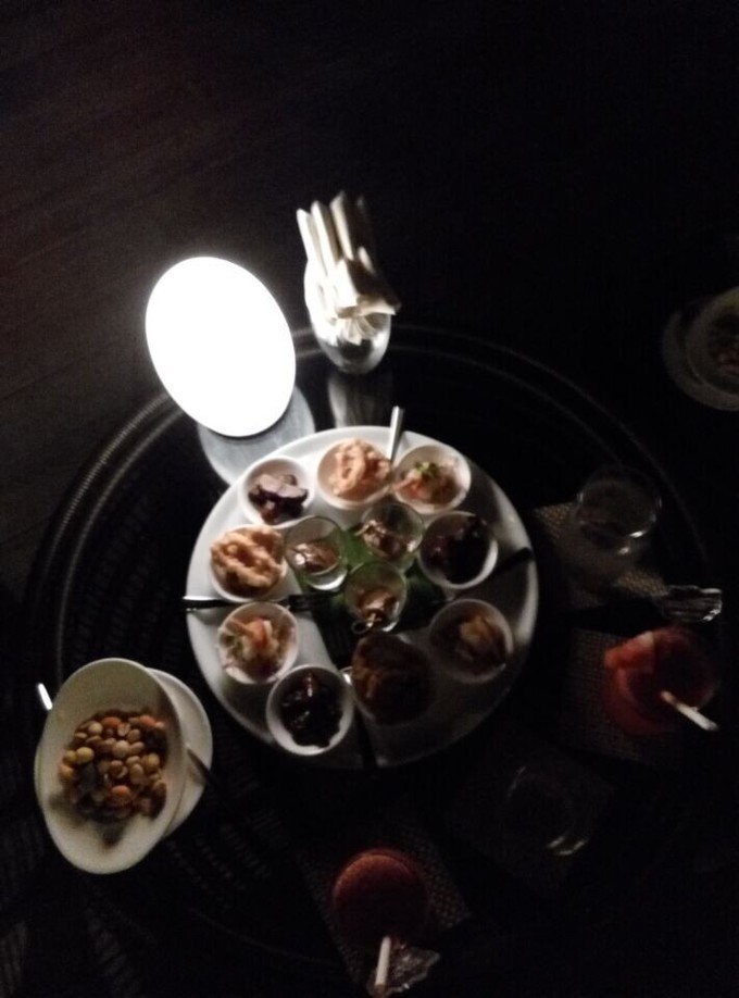 坐在二楼的酒吧,可以看到远处的灯光,他跟我们说,最左边的是 吉哈瓦酒店,中间的是四季兰达。最右边离我们最近的看的最清楚的是 阿米拉。