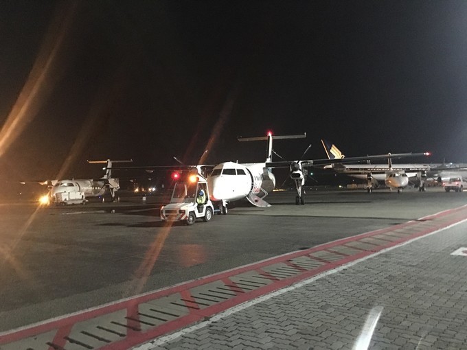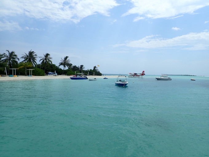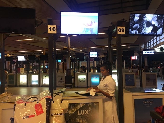 我们是当晚内飞上岛,很幸运天气还可以,上岛后中文服务告诉我们,真的不推荐客人当晚内飞上岛,因为我们到之前几天,天气不太好,晚上内飞取消航班了,客人没办法上岛,所以第一晚住机场岛过夜酒店比较合适,第二 天水 飞上岛。小黑拿过护照,办理好登机牌,我们等了几分钟就开始准备登机了。然后去中转岛坐快艇上岛。
