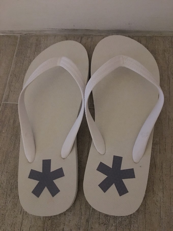 丽世的拖鞋,鞋底是LUX的标志,走在沙滩上会映出LUX的logo,古代鞋底印有莲花,步步生莲,丽世的拖鞋是步步有logo。心思巧妙啊,不过之一在丽世的沙滩上面才能有印记的,临走时可以带回国的!我就带回来了,留作纪念!