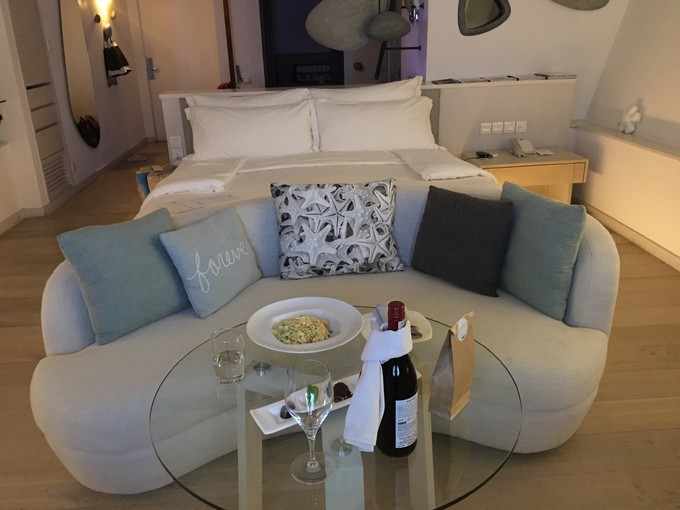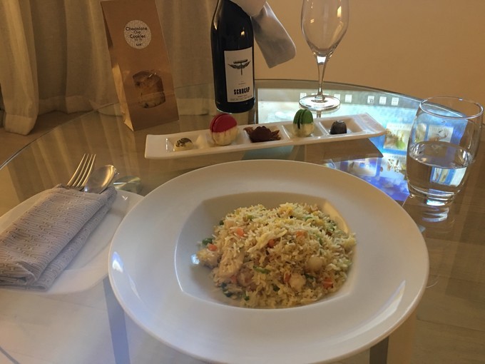 到达房间之后还是被丽世的精致小巧惊艳到了,房间虽然不大,但是很舒适,设备也很齐全,设施应有尽有的。衣帽间,洗浴间,大床,很温馨。因为新航晚上到达 马累 的航班,当晚上岛,餐厅已经不营业了,岛上贴心的小黑已经在房间里面给我们准备了海鲜炒饭,甜点和一瓶红酒。二话不说,坐下来开吃,飞机上面也吃过,不过小黑盛情准备了,也不能浪费不是,我全部吃完了,味道还是棒棒哒!马卡龙太甜了,果断放弃了。纸袋子里面还有准备桃酥类似的,很贴心!