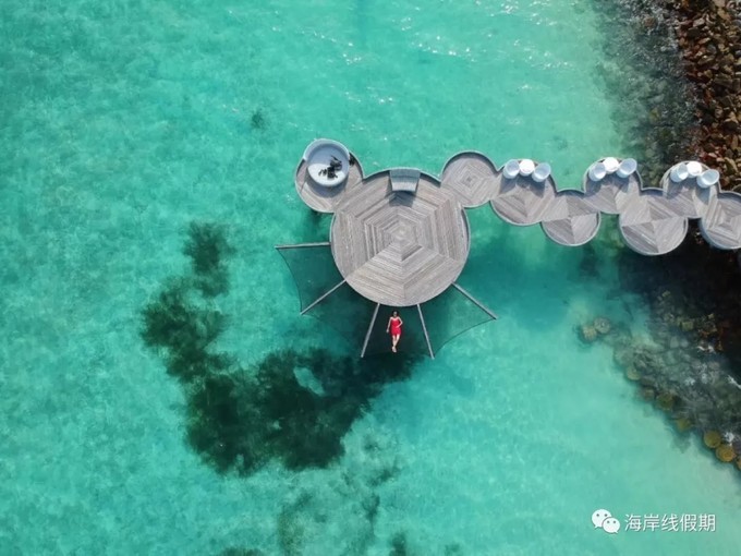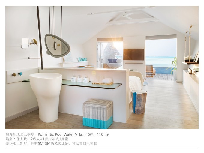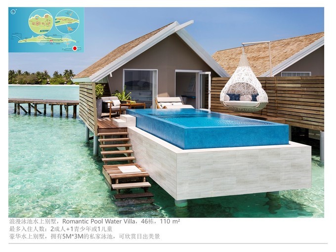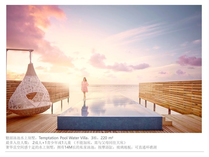 丽世度假村 新建 一种水屋房型,叫做浪漫泳池水屋,拥有5米*3米长的私家泳池,非常漂亮的,适合看日出的绝佳场所,私人无边泳池也特别适合各种拍照凹造型,漂浮早餐就可以放置在这个私人泳 池上面。还有一个适合各种躺的大蛋壳秋千吊篮。
