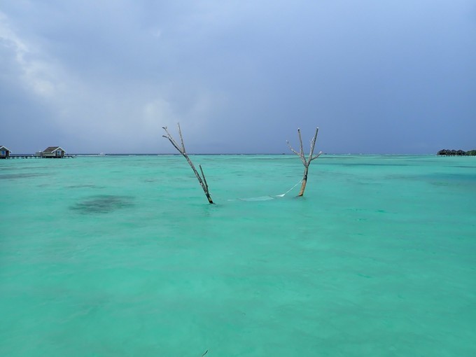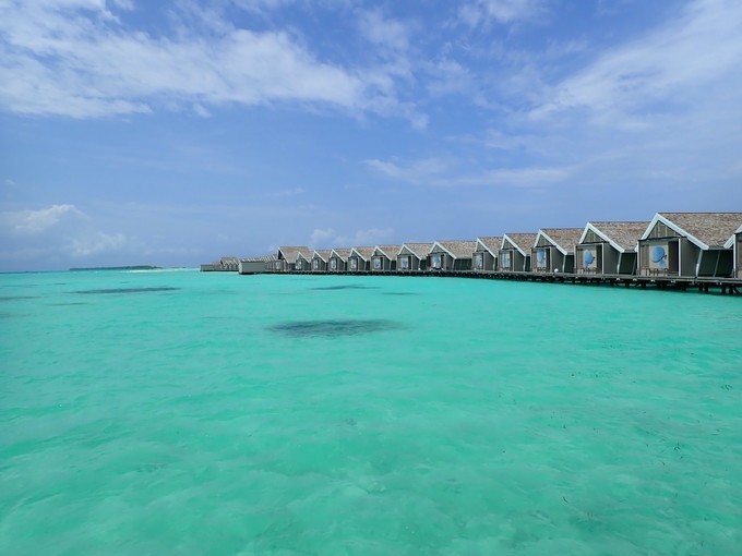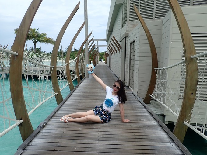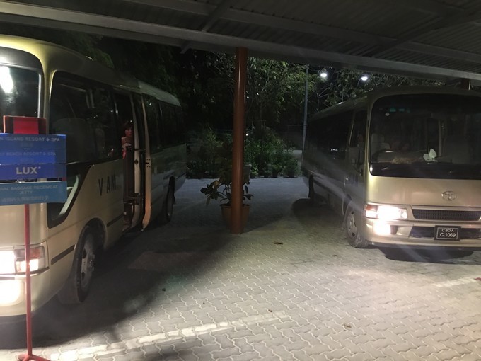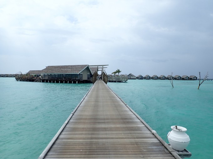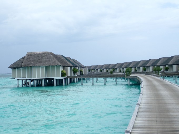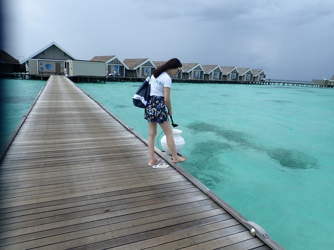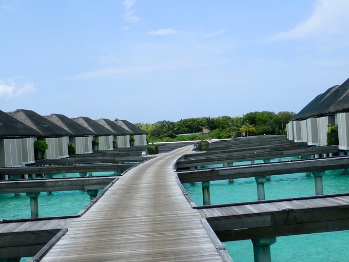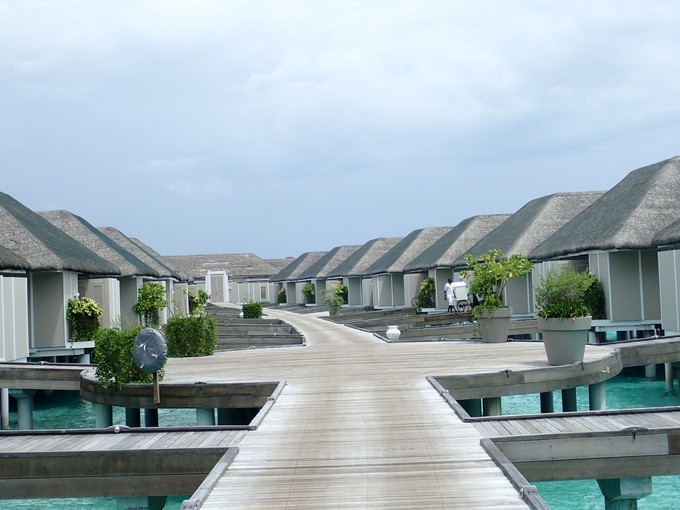 因为是晚上,我忘记坐了多长时间的快艇,昏昏欲睡的到达了美丽的丽世度假村。接我们的是中文服务,她给我们办理了入住,简单的介绍了一下岛屿的情况。坐着buggy车到达水屋栈桥的时候,中文服务告诉我们要下车,说是栈桥那边buggy车不能过去,我猜想是晚上的缘故,视线太昏暗。岛上也是有自行车的,是需要付费租借的,每天5美金的样子。有自行车环岛会方便一些。