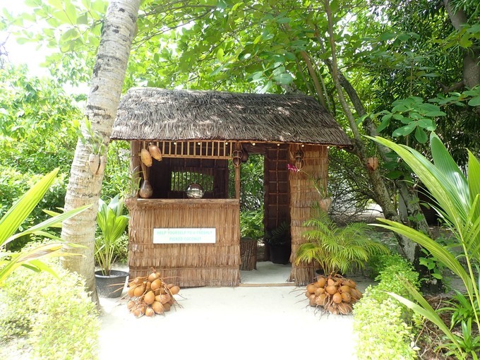 提供新鲜椰子肉的,具有 马尔代夫 当地特色的茅草屋,里面每天供应新鲜的椰子肉。椰子肉放在窗台的不锈钢器皿里面,茅草屋里面有桌子和板凳,木头制作的,很有当地气息。