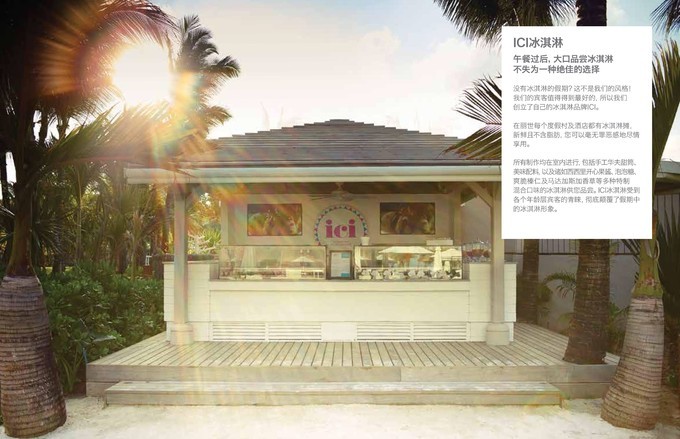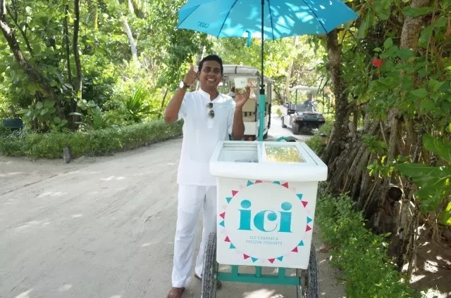 ICI冰淇淋是丽世自创的天然无脂冰淇淋,是吃了不会胖的冰淇淋,有各种口味,结合了岛上的各种独创元素,有椰子口味,菠萝口味,辣椒口味.....供客人选择,每天有两次时间会提供免费的冰淇淋小车,如果你找到这个小车,就可以免费享用,冰淇淋小车是停在前台的后方。真的是好吃不胖,减肥的小伙伴也可以放心吃。