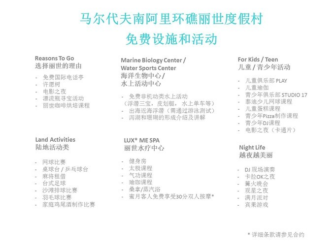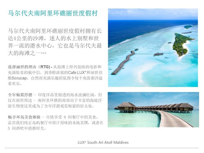 LUX*是一个拉丁文,代表的是明亮,光明的意思!丽世是轻奢华品牌,提倡给客人更轻盈,更明亮的一种度假体验,力求纯粹、清新,感性的款客之道,为宾客提供名副其实而又别具一格的体验。提供充满趣味和发自内心的热忱服务。给客人提供惊喜,非常贴近人心的服务。