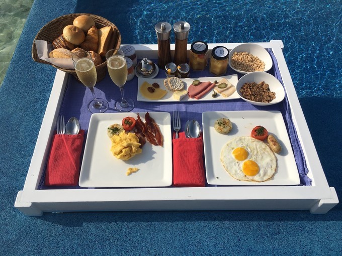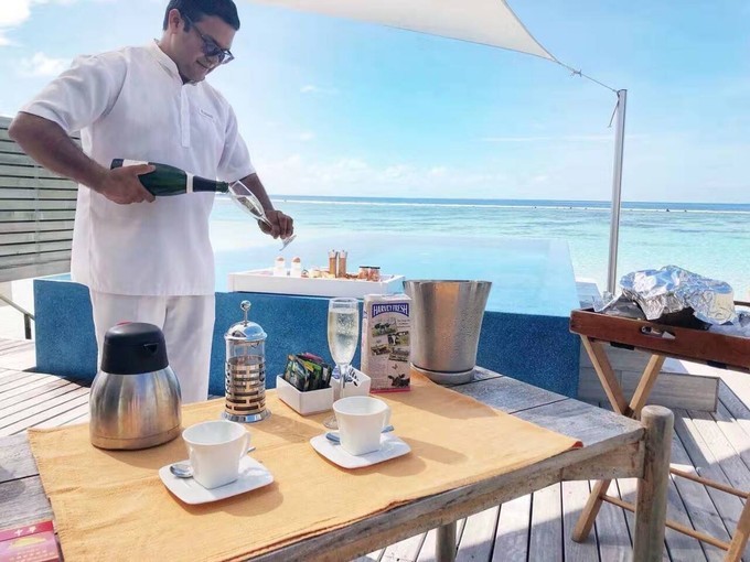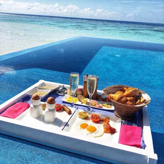 早安!浪漫洁白的丽世LUX!漂浮早餐------网红打卡景点之一!漂浮早餐从丽世度假村兴盛流行起来,引领了漂浮早餐的潮流啊!丽世以前的优惠是预定4晚浪漫泳池水屋,即送一次漂浮早餐,现在没有送了,也可以跟酒店预定的,大概是70美金一人的样子,具体价格以酒店为准。穿着比基尼,坐在泳池里面吃着早餐,喝着香槟,快哉悠哉!