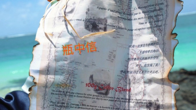 在岛上可能随处都会有惊喜,当你悠闲的漫步在岛上时,可能会在灌木丛中或在沙滩上发现半埋在其中的神秘物体,那就是神秘的漂流瓶。漂流瓶里面会有一张做的很古旧的卷纸,打开之后,惊喜呈现,将是酒店赠送的惊喜礼遇:可能是在沙滩上享用浪漫的双人烛光晚餐,或者SPA,或者深海潜水课程,或者一份巨大的披萨,在这个岛上,你将不会觉得无聊,因为时刻充满着惊喜。