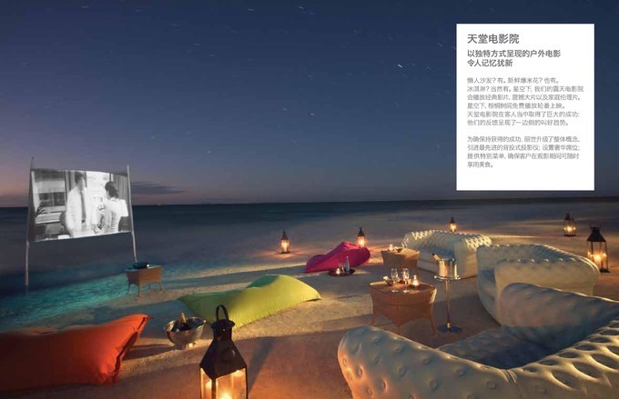 与爱人看电影一直是一件特别浪漫的事情,丽世度假村将电影院搬到了海上,被称为天堂电影院,在懒人沙发上,吃着新鲜现炸的爆米花,吃着冰激凌,在星空下,吹着海风,踏着沙滩,依偎着爱人,看着经典的电影,真的是一件很浪漫的事情。