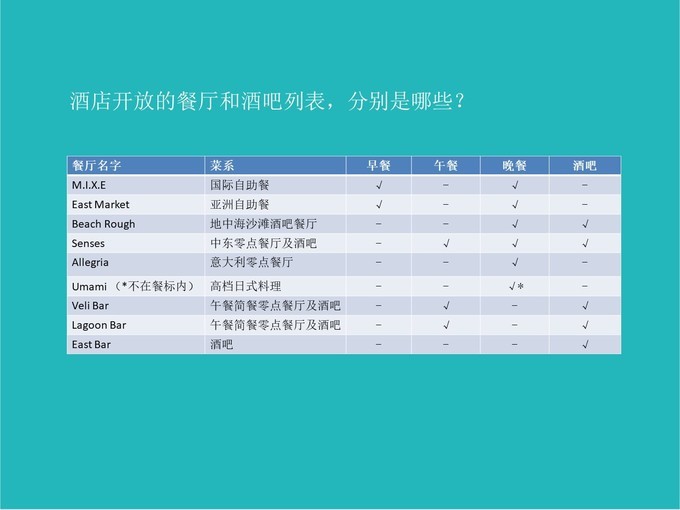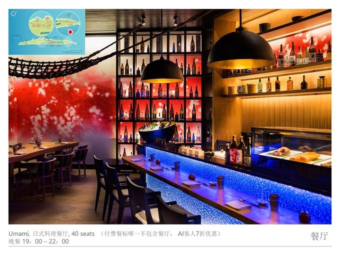 含HB早晚餐的客人可以在岛上的任意餐厅用餐,除了日式料理和主题特色餐之外,因为日式料理的座位很少,喜欢日料的客人很多,供不应求,所以日式料理不在免费用餐之列。
