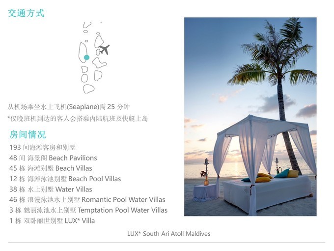 水上别墅有三种,Water villa 水上别墅,面积非常大,有一个非常漂亮的无敌海景浴缸,前面有一个网床和玻璃地板,浪漫水屋私人别墅是16年 新建 的,前面有介绍。浪漫泳池水屋的房间号,小号有拖尾沙滩的延伸,大号是房间的间隔非常大,只有2-3间的间隔是很大的,是欣赏日出的最佳地点。看小伙伴的侧重点。丽世的房间都很精致舒适,很温馨,有家的感觉。