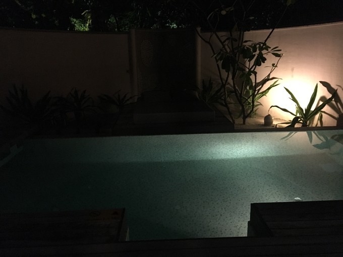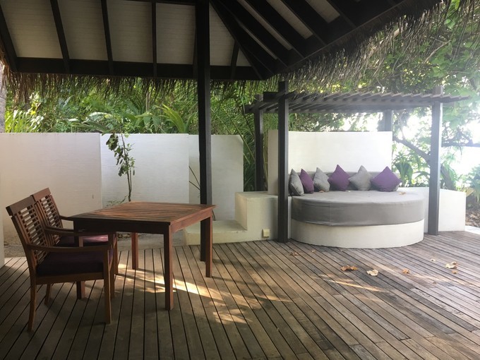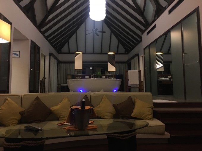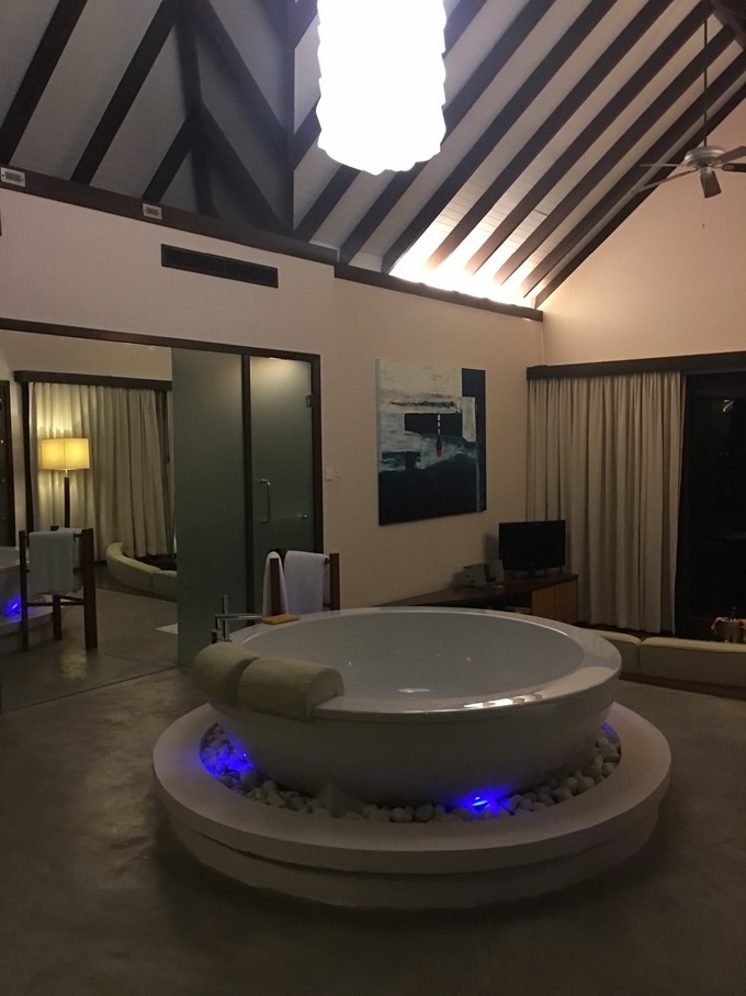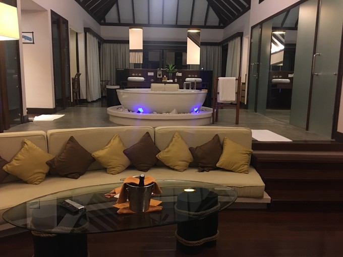 接下来介绍的是沙屋,我们入住的也是沙屋。个人体验,沙屋的空调声音比较大,饮用水早晚各一瓶,1.5L的,我们觉得不够喝。浴室和卫生间在室内感觉有点怪。因为这个岛的定位刚开始是蜜月的。房间中间有一个很大的浴缸。泳池在后花园,前院有一个发呆亭。房间前面是一个客厅,有大沙发,然后就是大浴缸,大浴缸圆圆的,像一个大碗。然后床是面对后院的泳池。