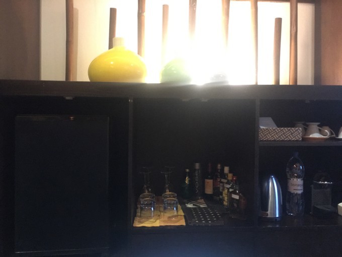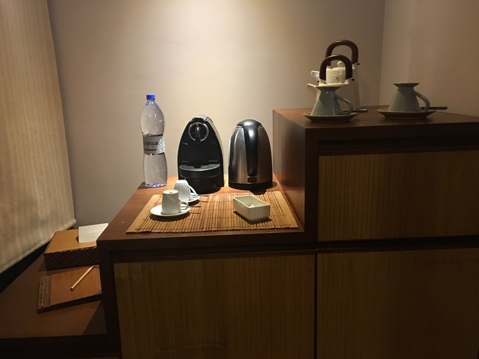 房间里面的烧水壶,一瓶1.5L的瓶装水,早晚各一瓶,喝完需要自费续。咖啡机,胶囊,茶包都是免费的。其他的酒水饮料是收费的。