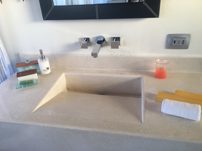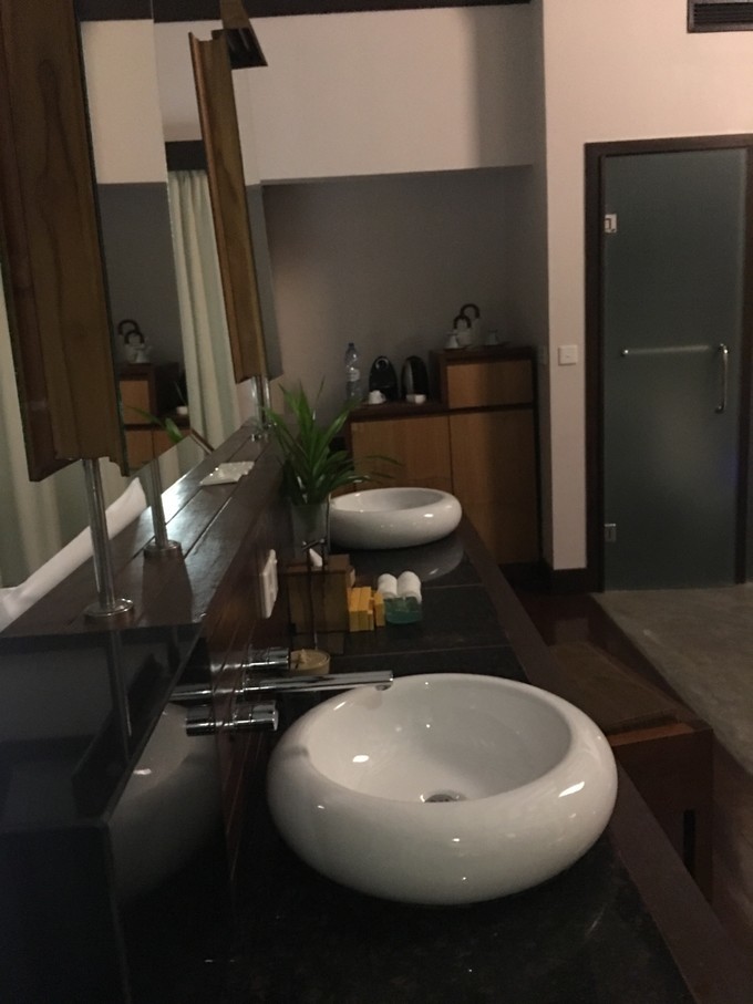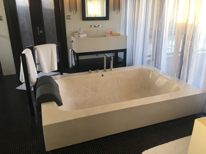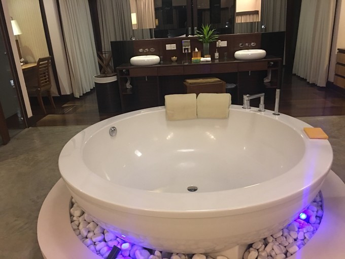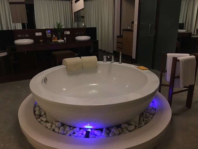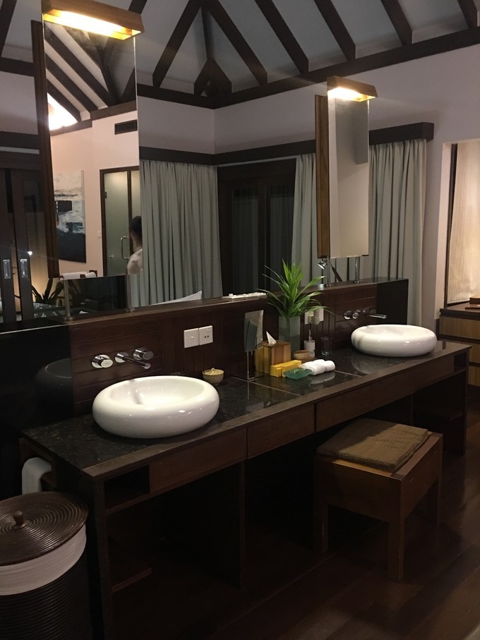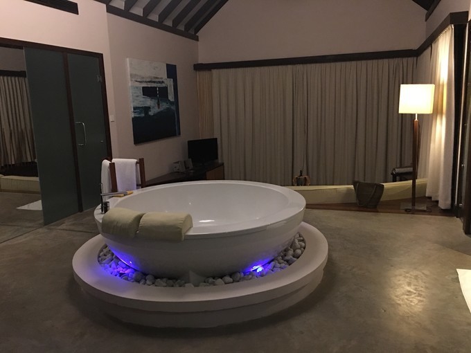 波杜希蒂的所有房间都是有私人泳池的,原本的定位是 蜜月岛 屿,所有岛上没有儿童乐园,沙屋的浴室也是在室内的,室内中间有一个超大的像大碗一样的浴缸。